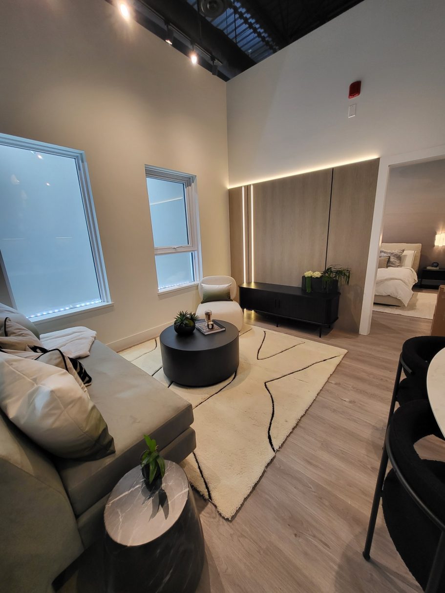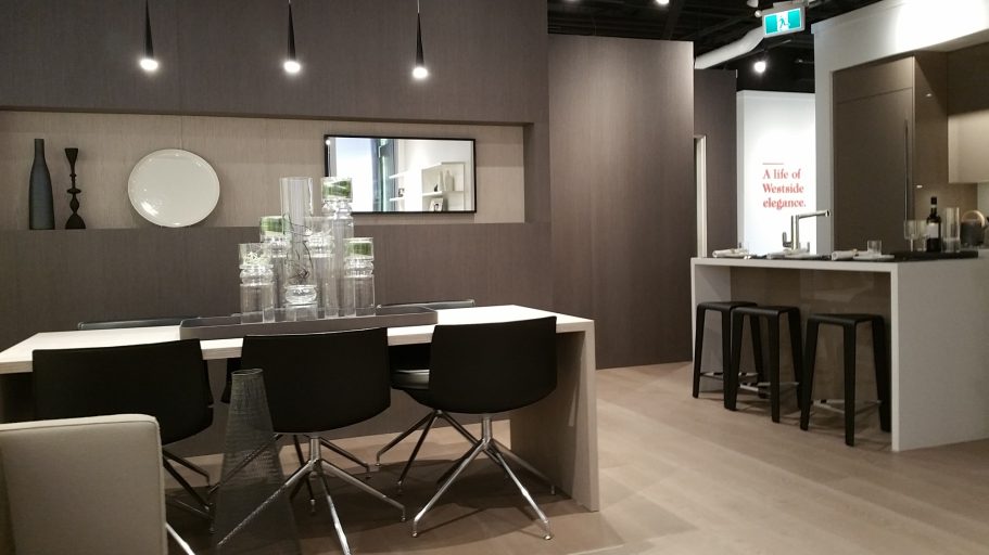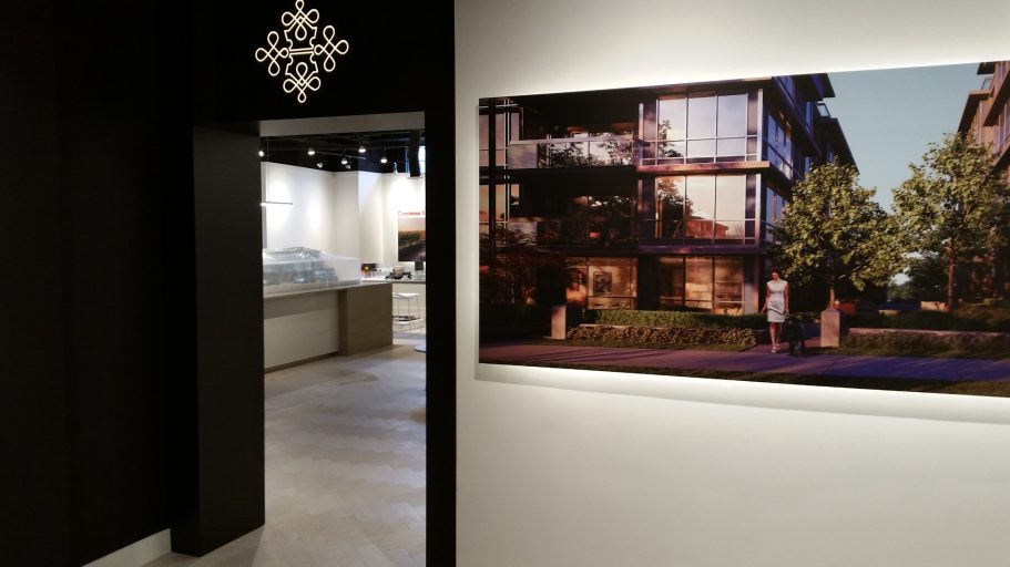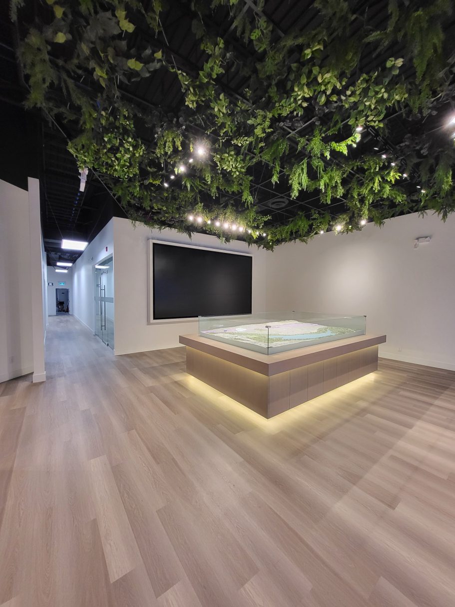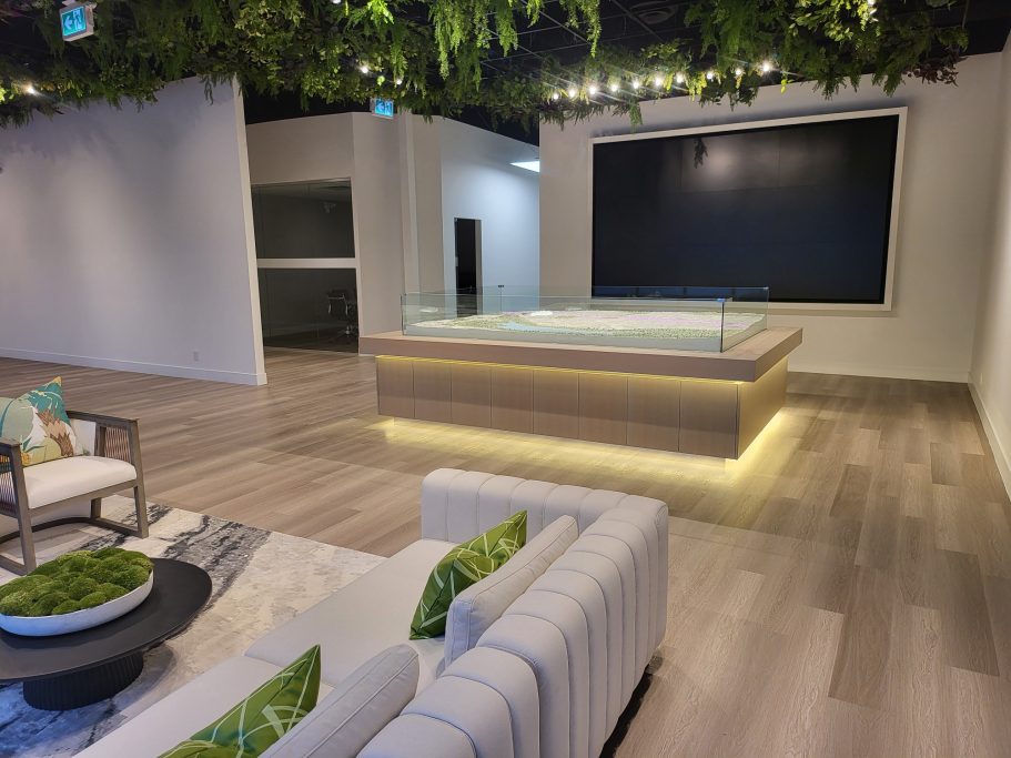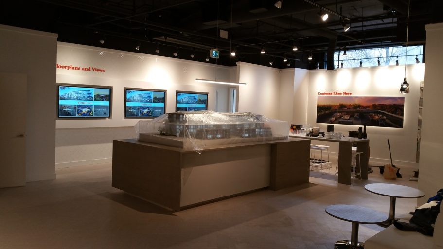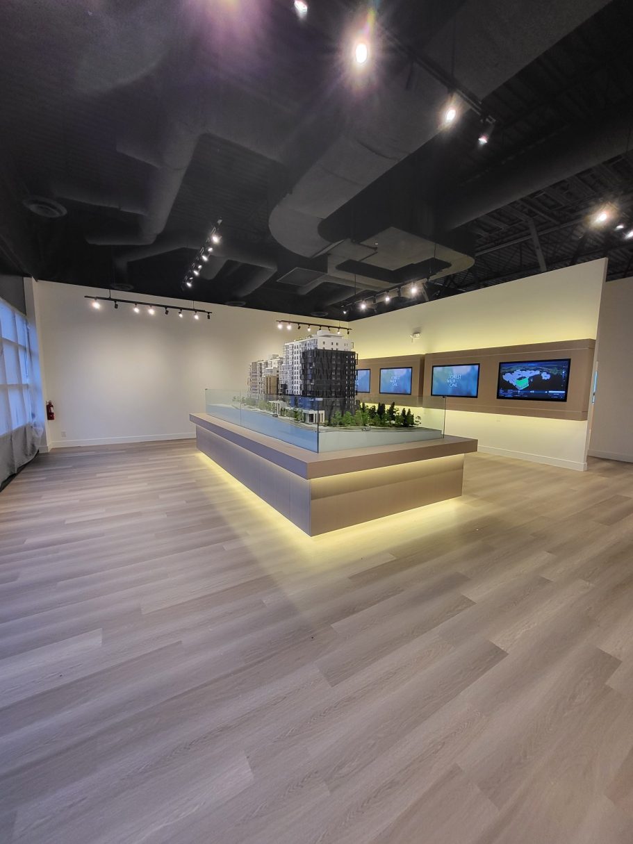 Modern interior of a spacious exhibition area with a model display and digital screens.