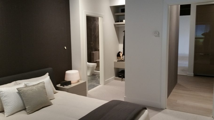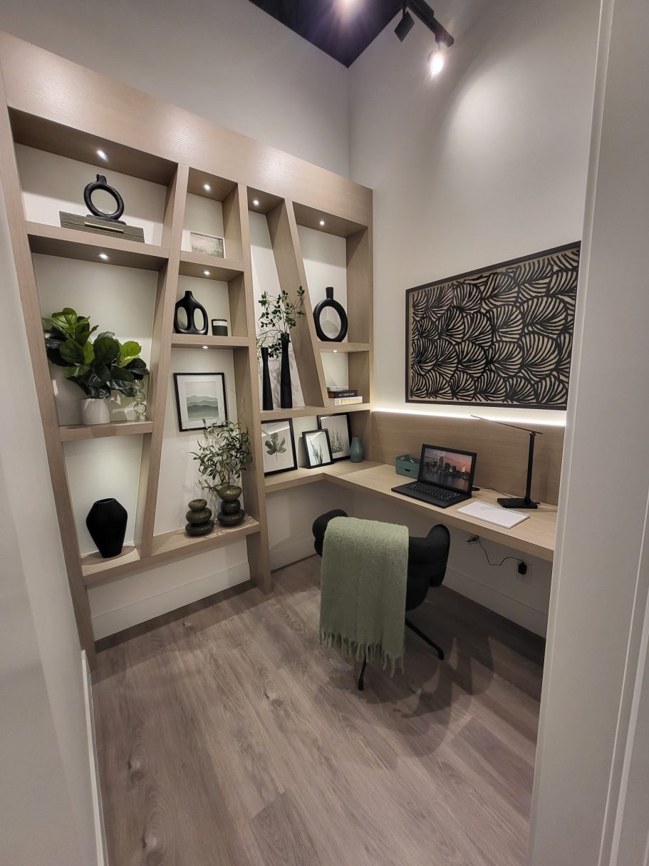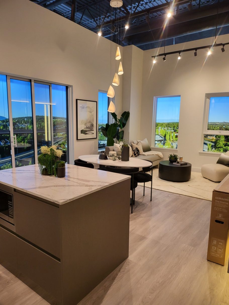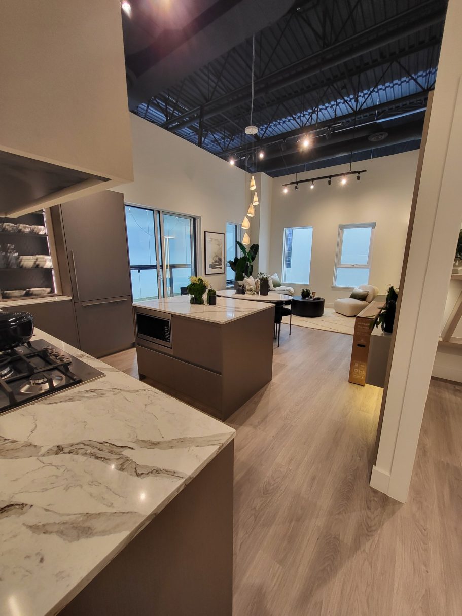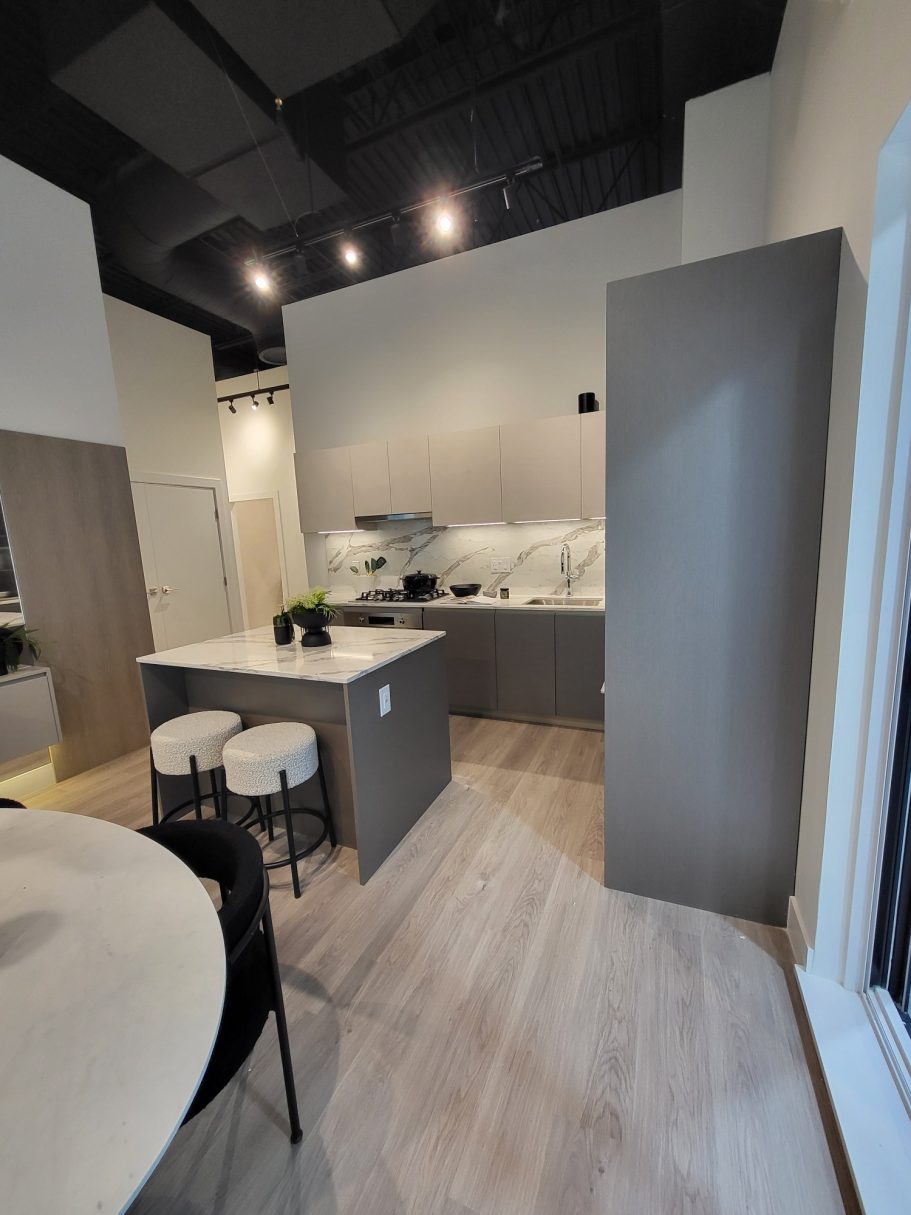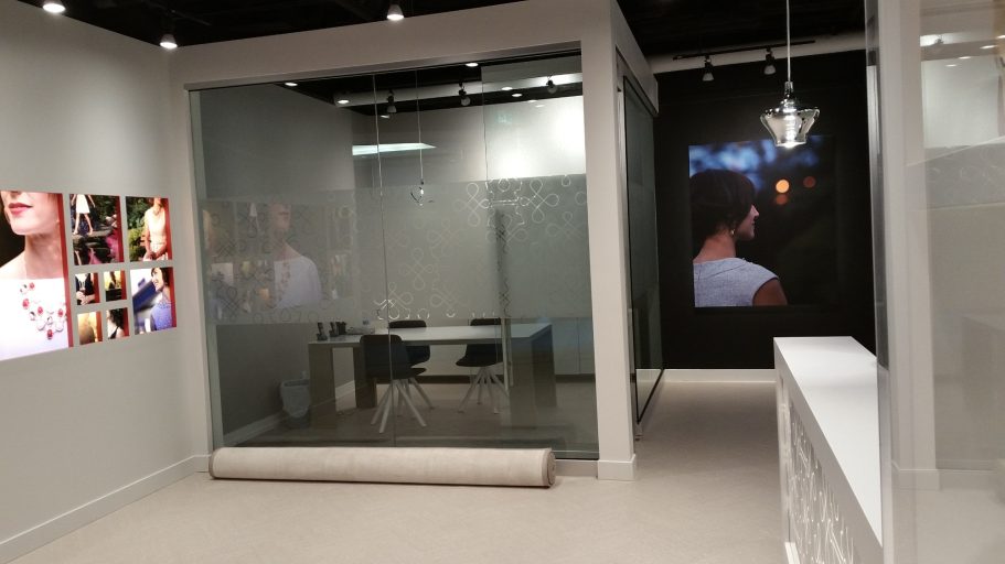 Modern interior of a spacious exhibition area with a model display and digital screens.