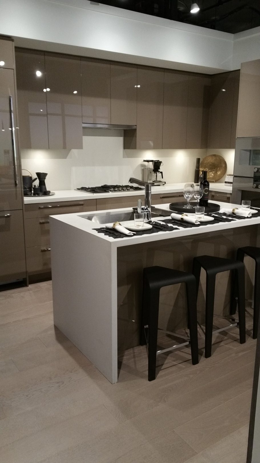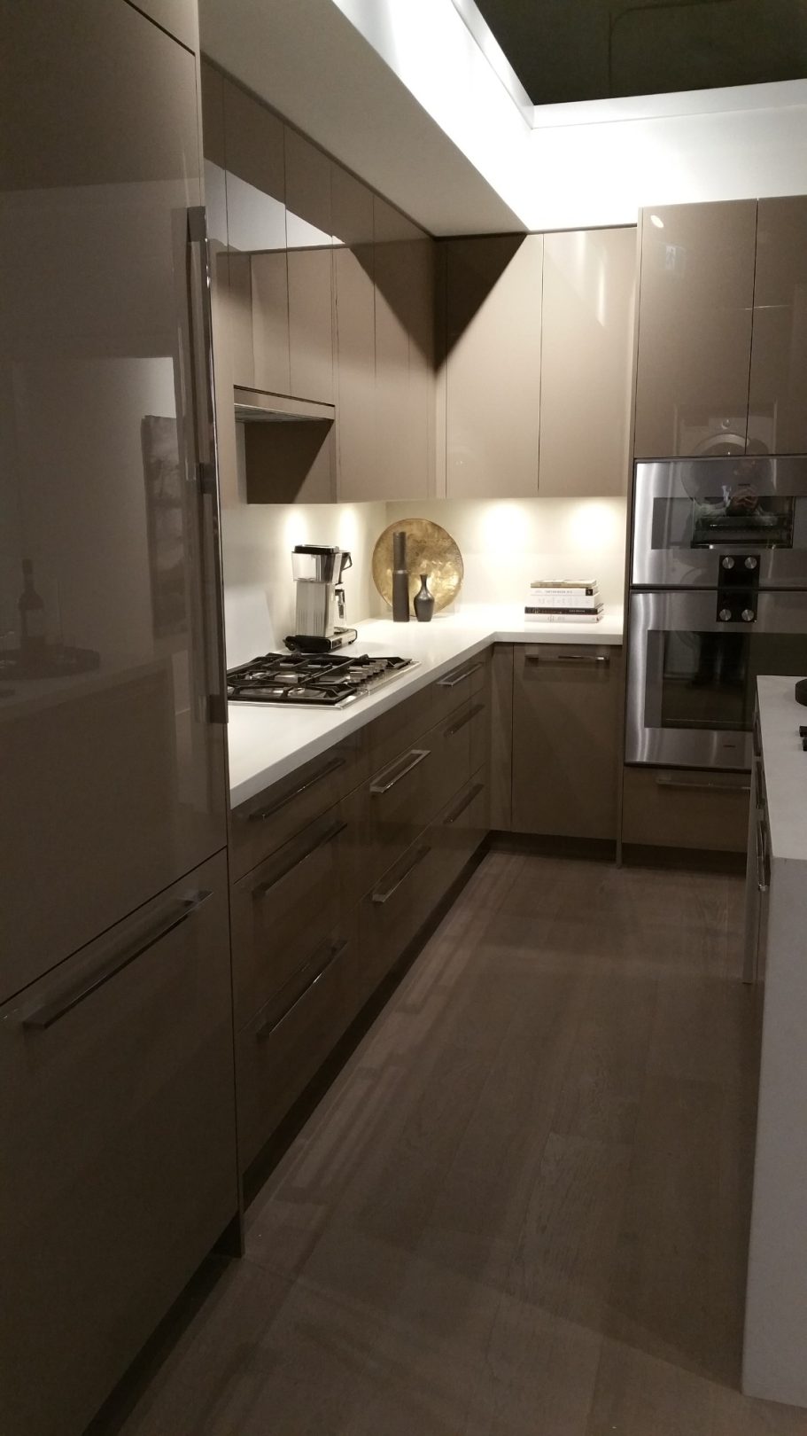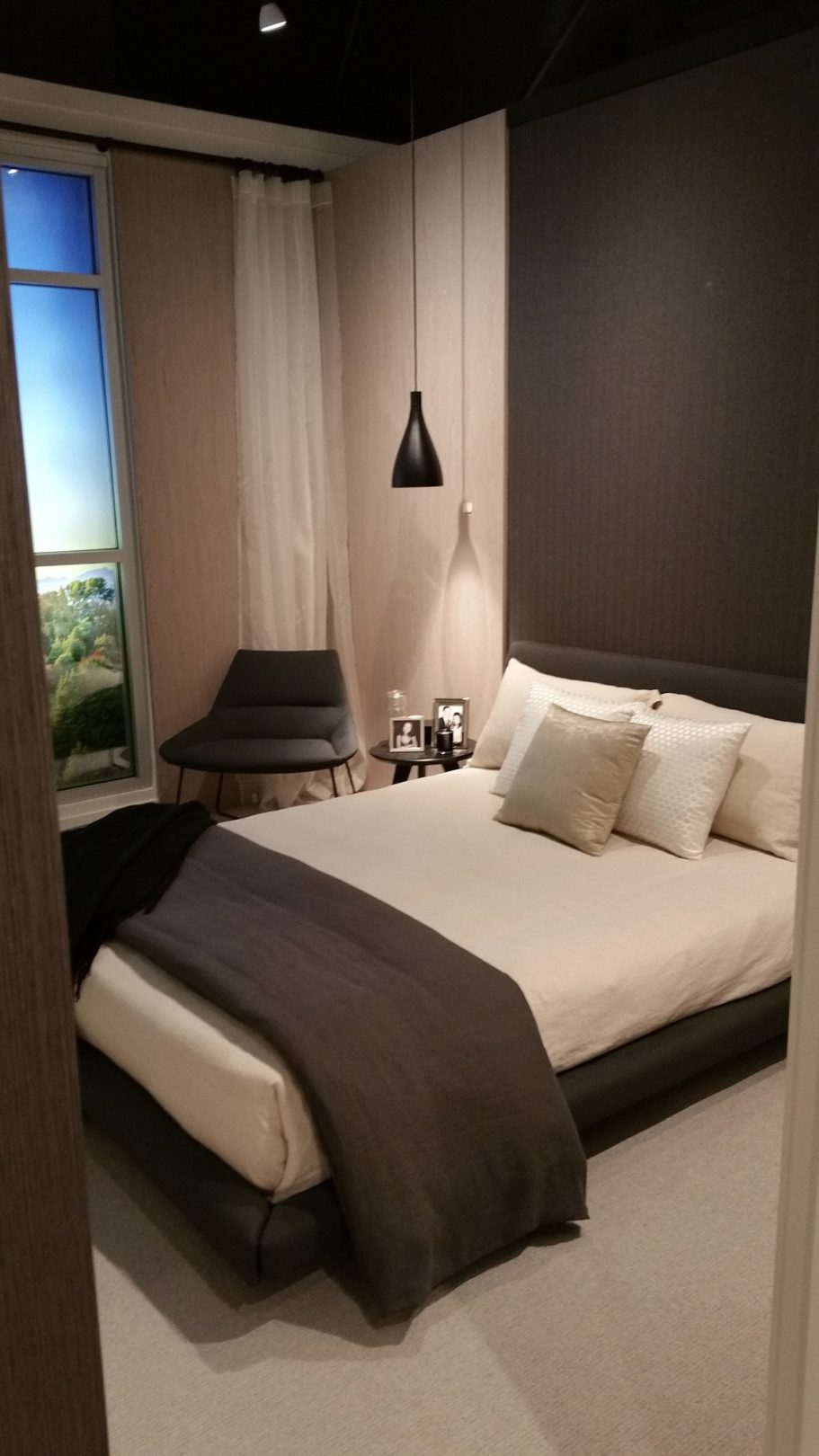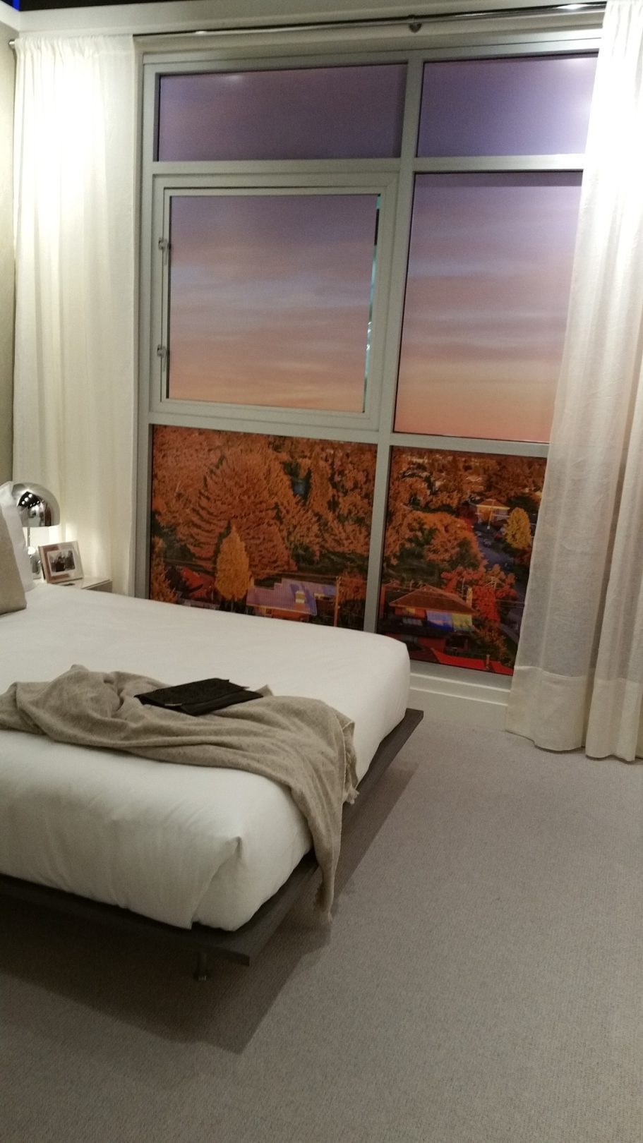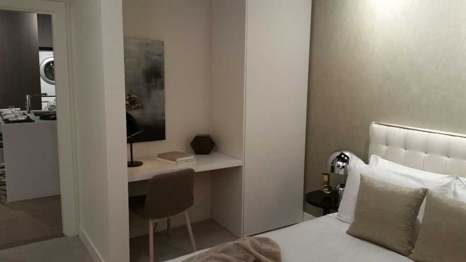 Modern interior of a spacious exhibition area with a model display and digital screens.
